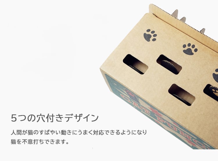 5つの穴からおもちゃや飼い主さんの手を出し入れして、猫ちゃんと楽しく遊べます。