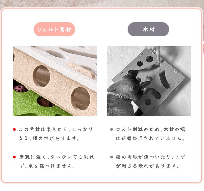 - 摩耗に強い全面フェルト構造で、愛猫が引っかいても削れず、爪を傷つける心配がありません!