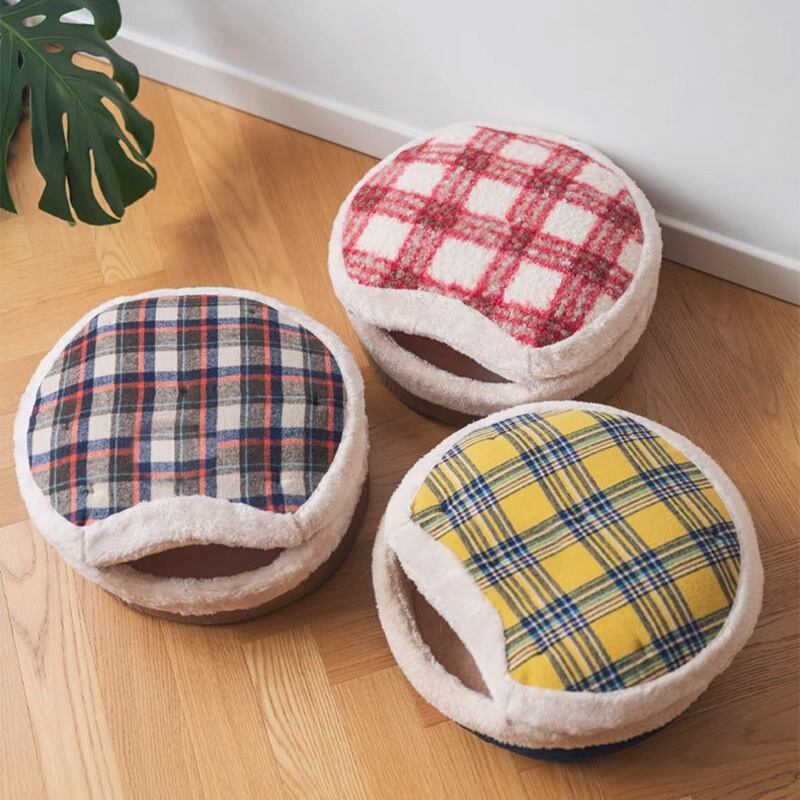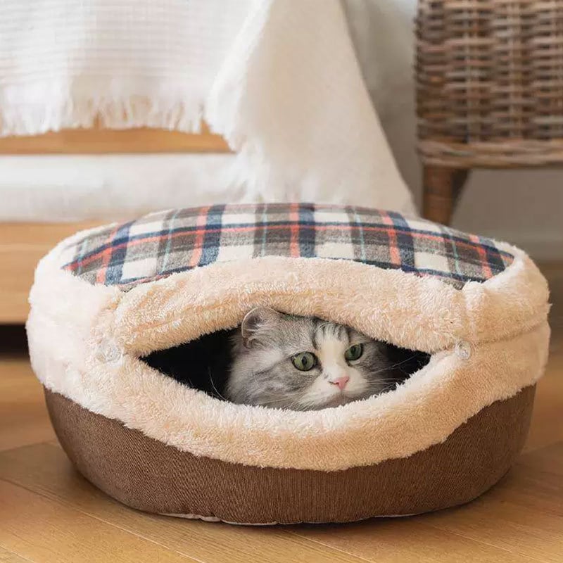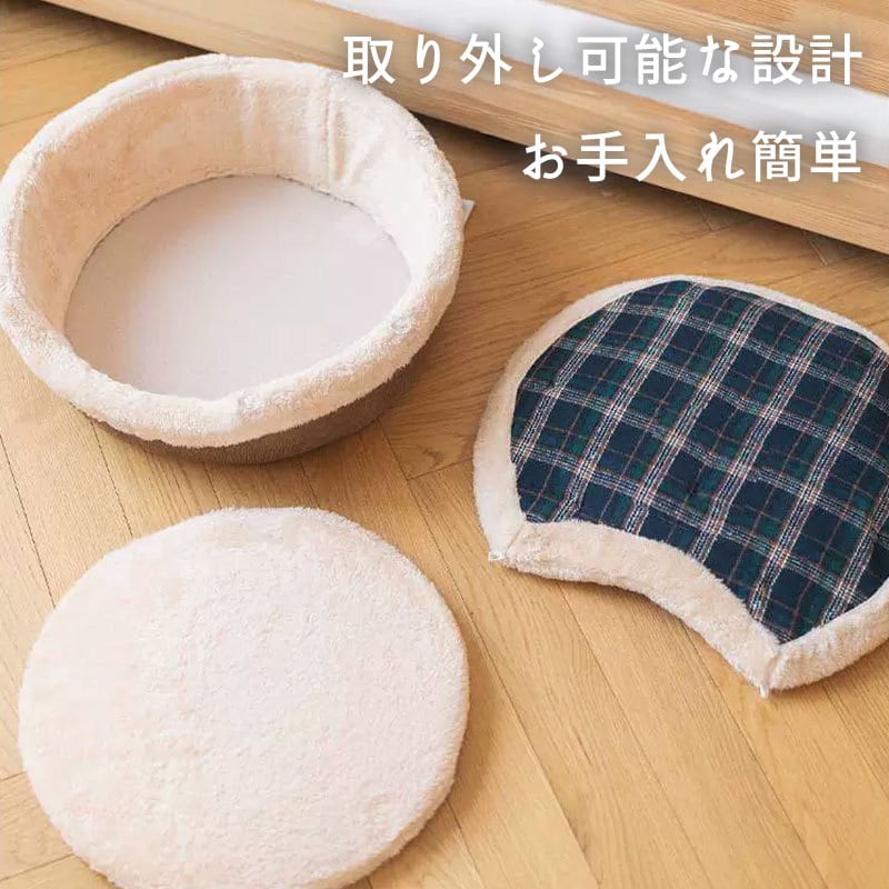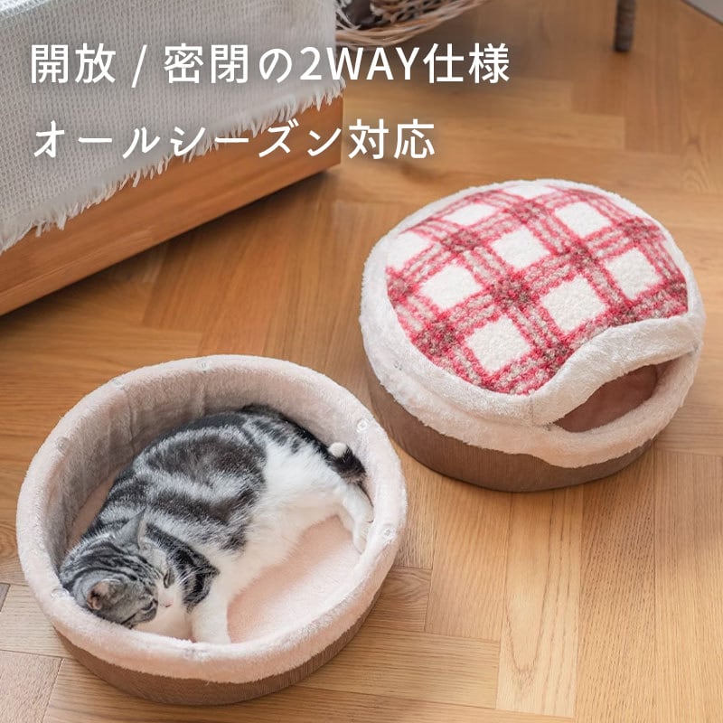 ふんわり可愛いチェック柄で、お部屋のインテリアにも映える愛らしいデザイン。ねこちゃんが思わず入りたくなる、もぐり込み型ハウスです。