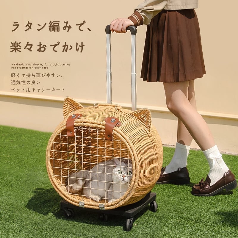 可愛い!ポータブルキャスター付きキャリーバッグ(猫型ラタンバスケット)